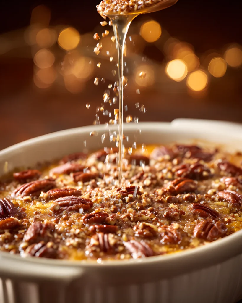 When you’re ready to serve, drizzle warm maple syrup generously over each portion. The syrup blends beautifully with the buttery praline topping, creating a rich and satisfying bite every time.