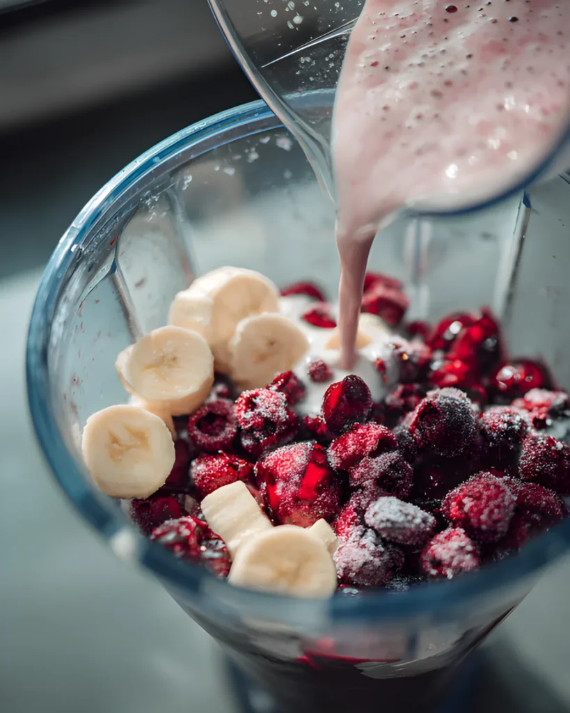 Second, the ingredients deliver both flavor and nutrition. Frozen berries bring antioxidants and vibrant color. Banana creates natural sweetness and creamy texture. Almond milk keeps the base light while protein powder adds energy that lasts through the morning.