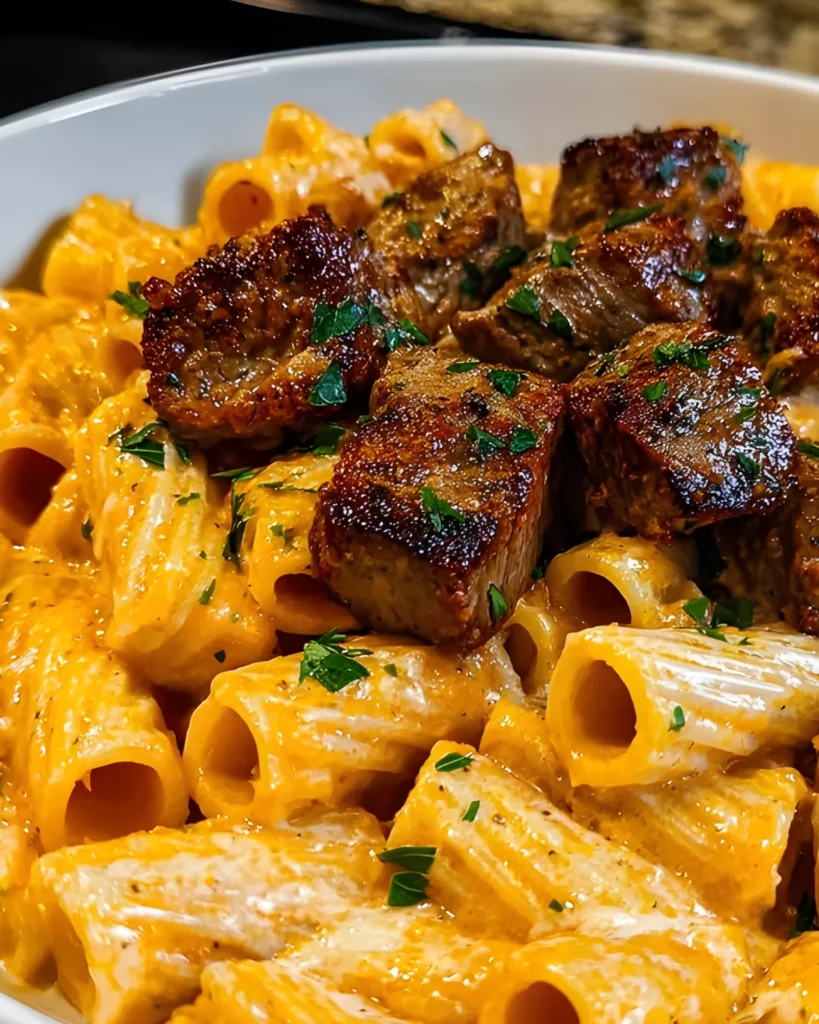 5. Toss cooked rigatoni into the sauce, adding reserved pasta water as needed to thin. Fold in steak tips gently.