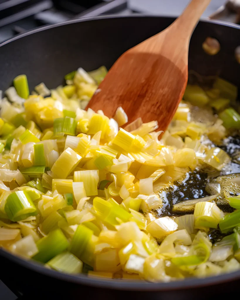 Making a cheesy asparagus tart may look fancy, but the process stays surprisingly simple. First, cook the leeks in butter until they turn soft and golden. This step builds a sweet and savory base that enhances the entire tart.