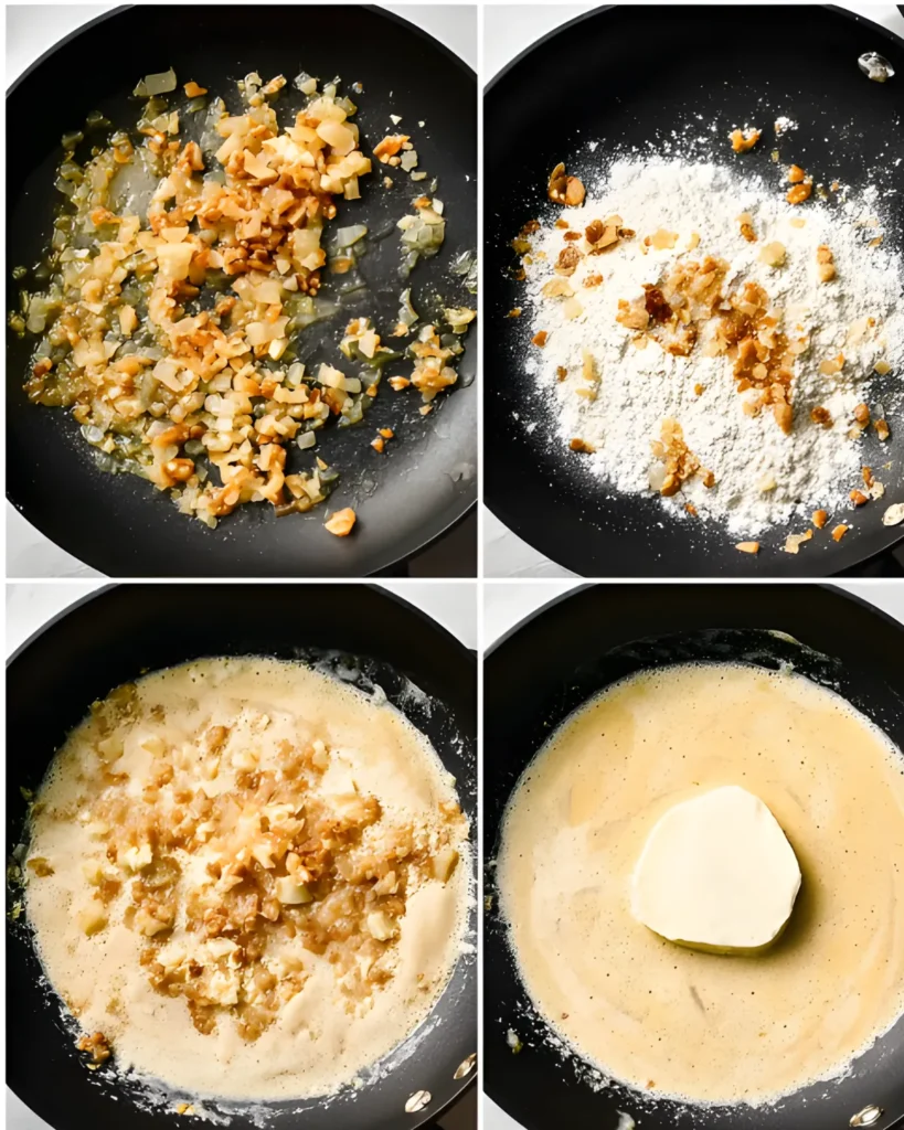 | 4 | In the same pan, sauté onion and garlic in olive oil. Whisk in flour until golden. |