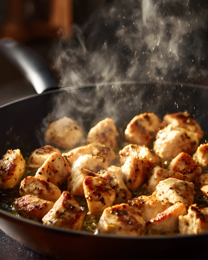 Next, melt butter in a large pot over medium heat. Add the seasoned chicken and cook until the pieces turn lightly golden and fully cooked. This usually takes about five minutes. Remove the chicken from the pot and set it aside.