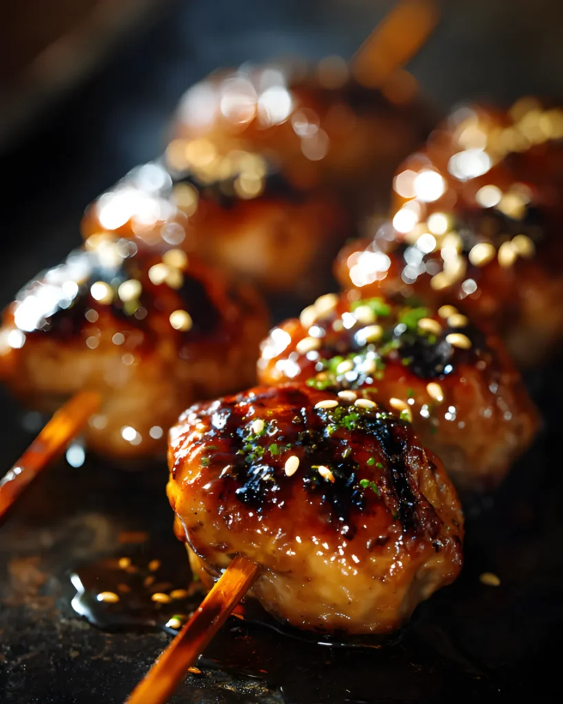 Juicy Chicken Tsukune skewers glazed with authentic sweet-savory tare sauce, perfect as Japanese appetizers or party food.