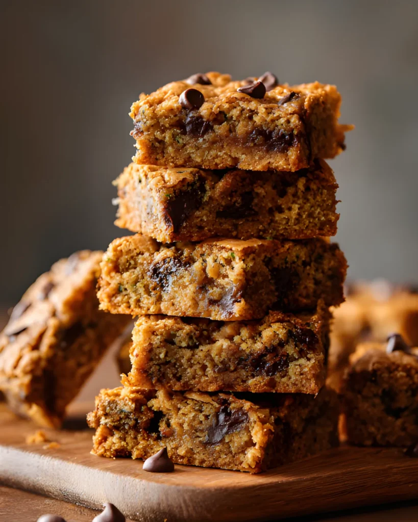 Stacked Chocolate Chip Zucchini Cookie Bars on a wooden board with visible chocolate chips and shredded zucchini in a soft, golden crumb.
