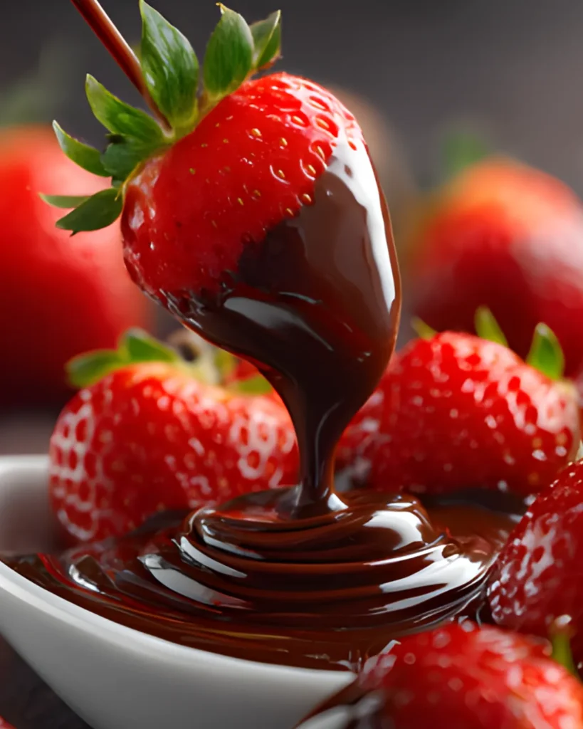 2. Dip each strawberry into the melted chocolate, shake off the excess, and place on parchment paper to set.