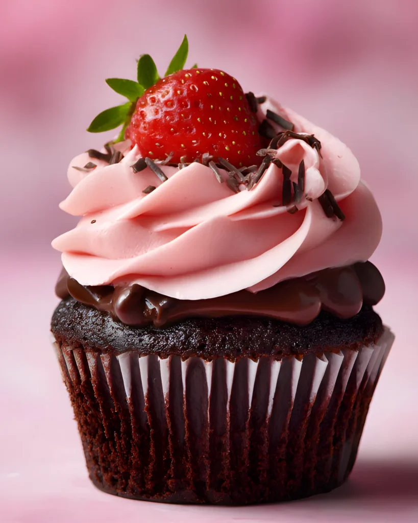 Texture also plays a big role. The soft chocolate cupcake contrasts with smooth strawberry frosting and the slightly crisp chocolate shell on the strawberry topping. Each layer adds something unique.