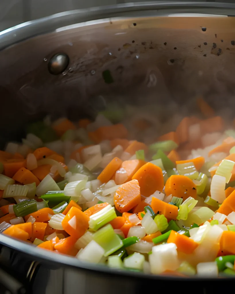 First, sautéed vegetables create the flavor base. Onion, celery, and carrots—often called the “classic soup trio”—develop natural sweetness when cooked in butter. This step builds a deeper flavor before adding the broth.
