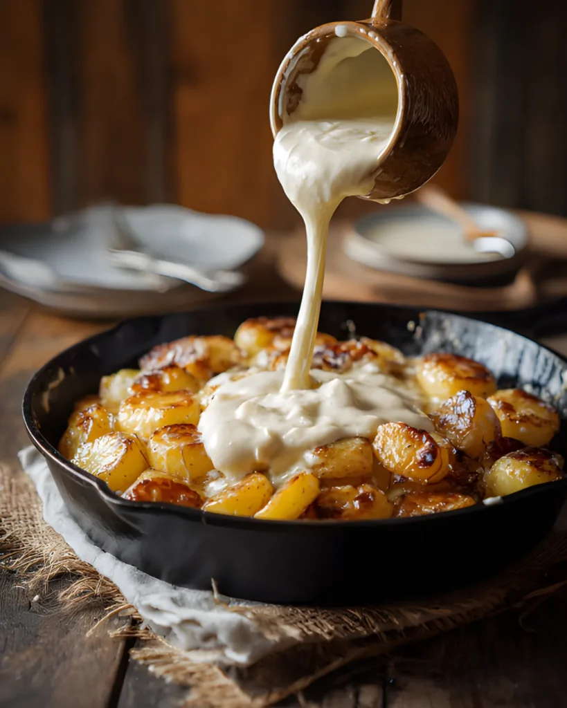 After that, arrange the potatoes in a spiral or layered pattern. Pour the infused cream evenly so every slice absorbs moisture. Cover tightly before baking to lock in steam, which helps soften the potatoes.