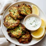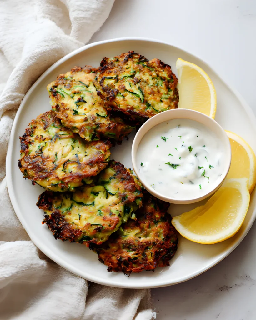 I often plate this crispy zucchini fritters recipe with a simple yogurt dip, sour cream, or marinara sauce. Because the fritters carry savory Parmesan notes, creamy dips balance them beautifully. You can also top them with a squeeze of fresh lemon for brightness.