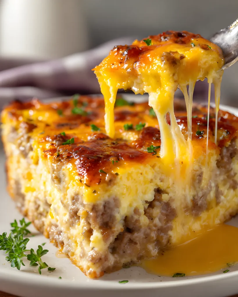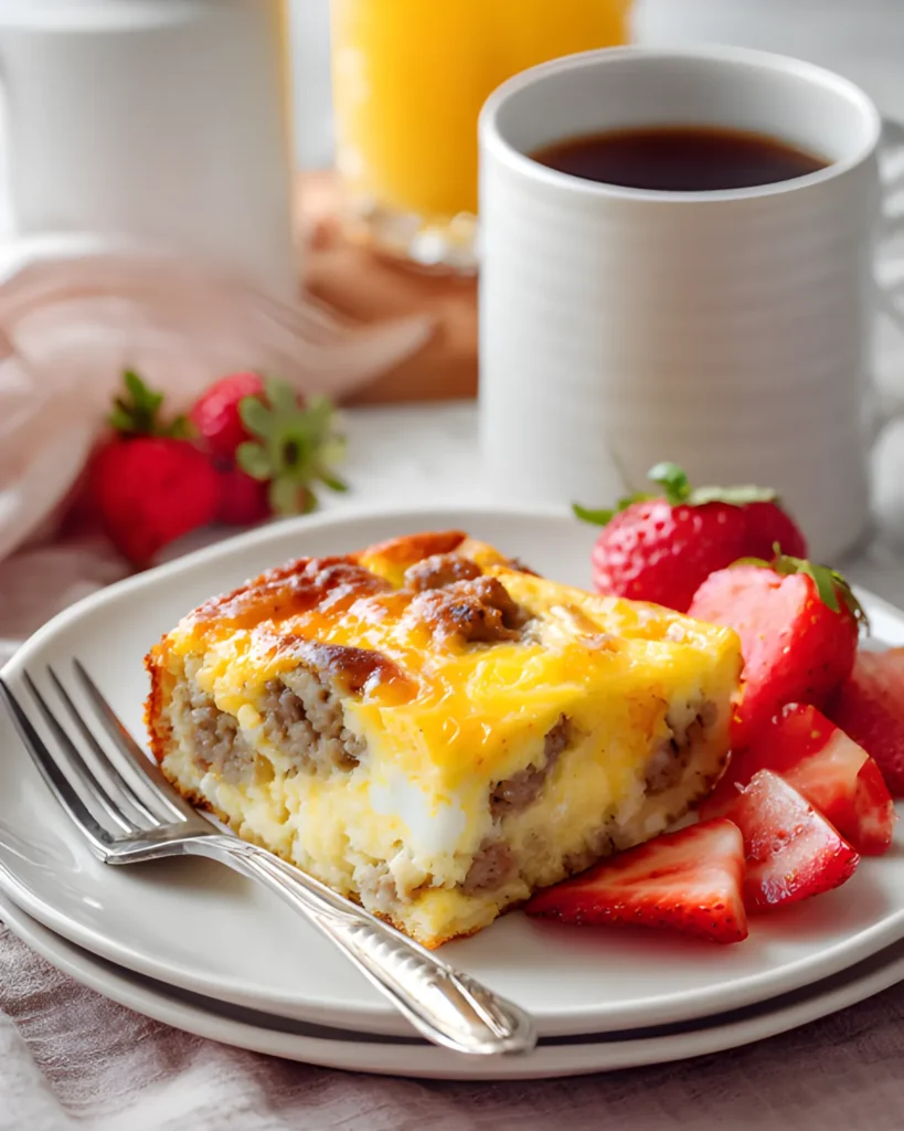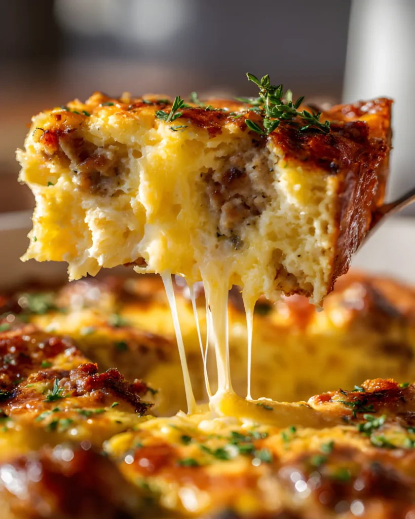 Bake for 30–40 minutes. The center should set fully, and the top should turn golden brown. Let the Easy Sausage and Egg Casserole cool for five minutes before slicing.