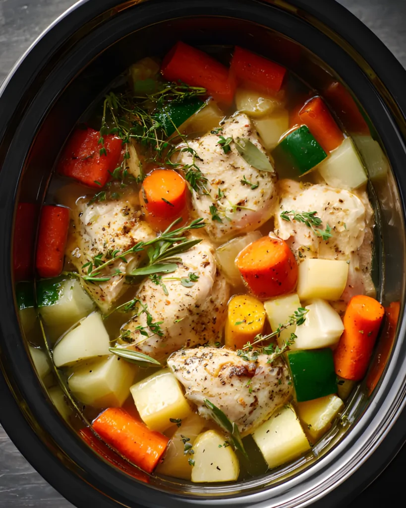 First, always place the chicken at the bottom of the slow cooker. This ensures even cooking and allows it to soak up all the flavors from the broth and seasonings. Then, layer the vegetables on top so they soften perfectly without becoming mushy.