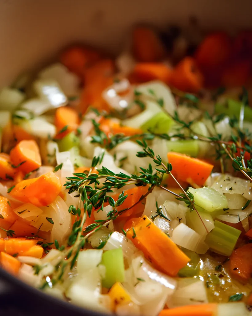 Next, heat olive oil in a pot over medium heat. Add the onions and salt, then sauté for about three minutes. Stir often so the onions soften without burning. Then, add the carrots and celery. Continue cooking for another five minutes, allowing the vegetables to release their natural sweetness.