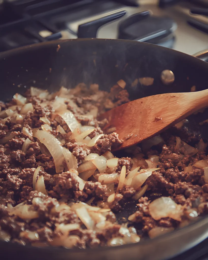Second, browning the beef with onions builds deep flavor. Cooking them together helps the onion release natural sweetness that balances the savory meat.