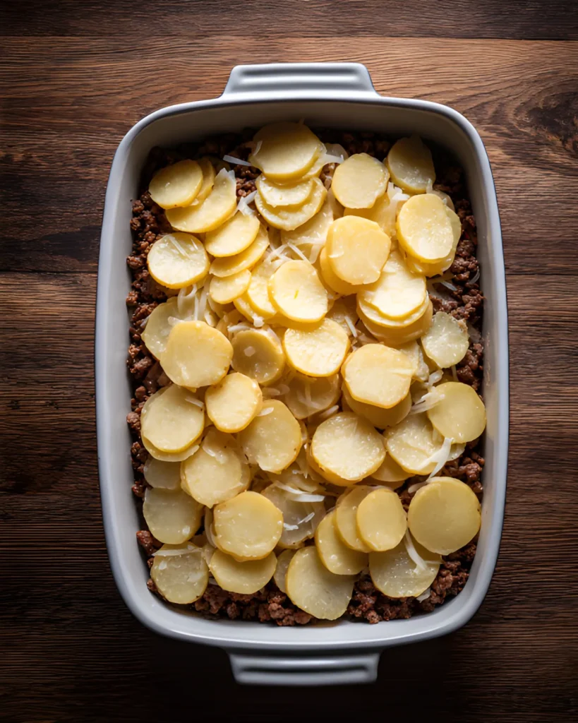Layering ensures every bite contains a perfect balance of beef and potatoes.