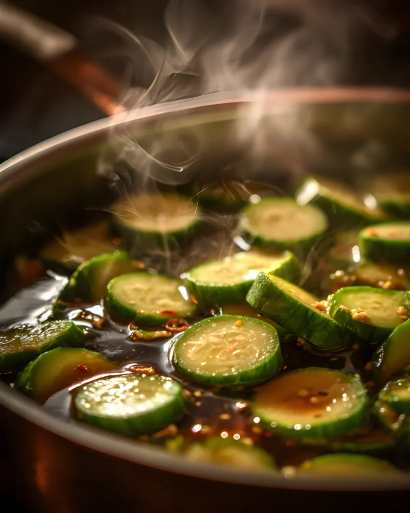 Add the cucumbers to the saucepan. Let them simmer over medium-high heat for 5 minutes. This brief cooking step allows the flavors to penetrate without making the cucumbers soft. - Cool and store
