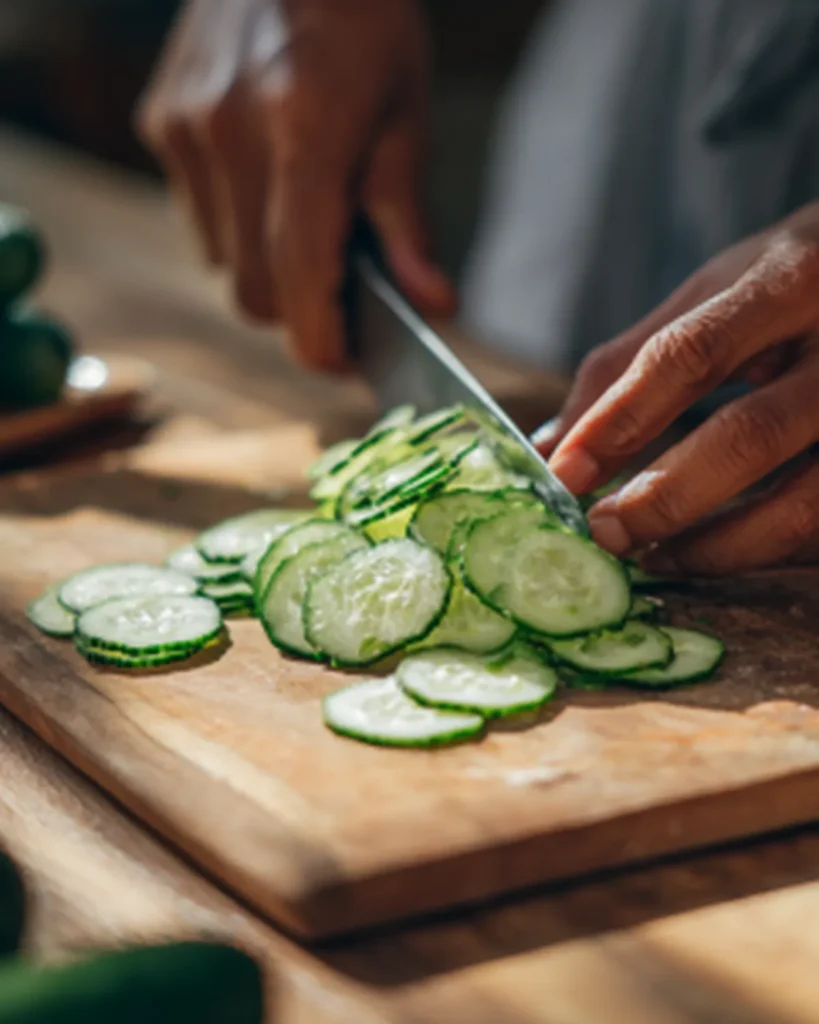 Next, sprinkle salt over the cucumbers and let them sit for about 8 to 12 minutes. This process draws out excess moisture and improves texture. After that, rinse the cucumbers under cold water to remove extra salt. Then gently pat them dry with paper towels.