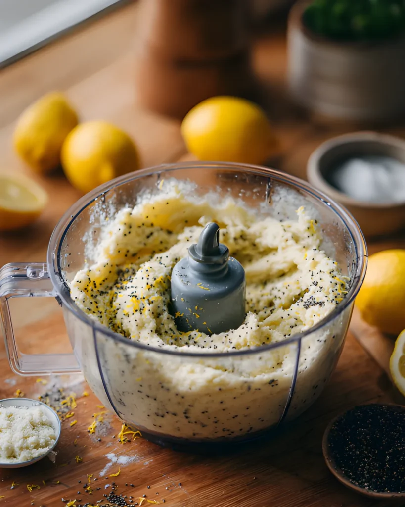 In a large food processor bowl, combine the dry ingredients. Add all-purpose flour, sugar, poppy seeds, baking powder, lemon zest, and kosher salt. Pulse a few times until everything mixes evenly.