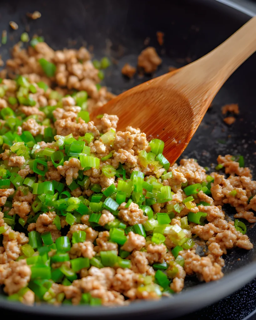 Heat peanut oil in a large skillet over medium-high heat. Add ground pork and 1/4 cup sliced green onions. Break the meat apart as it cooks. Continue cooking until browned and fully done. Proper browning builds flavor, so don’t rush this step.