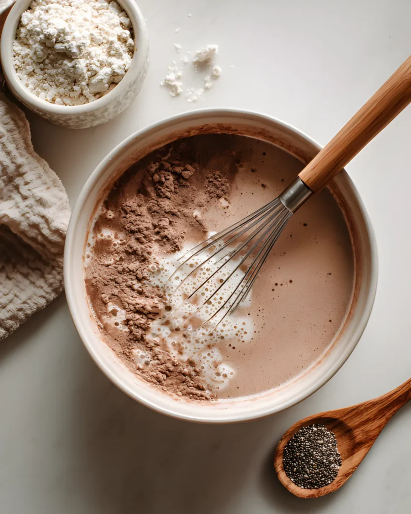In a bowl or jar, whisk your plant-based milk, protein powder, cocoa powder, maple syrup, vanilla, and sea salt until it’s fully smooth. This step ensures your protein powder doesn’t clump later on.