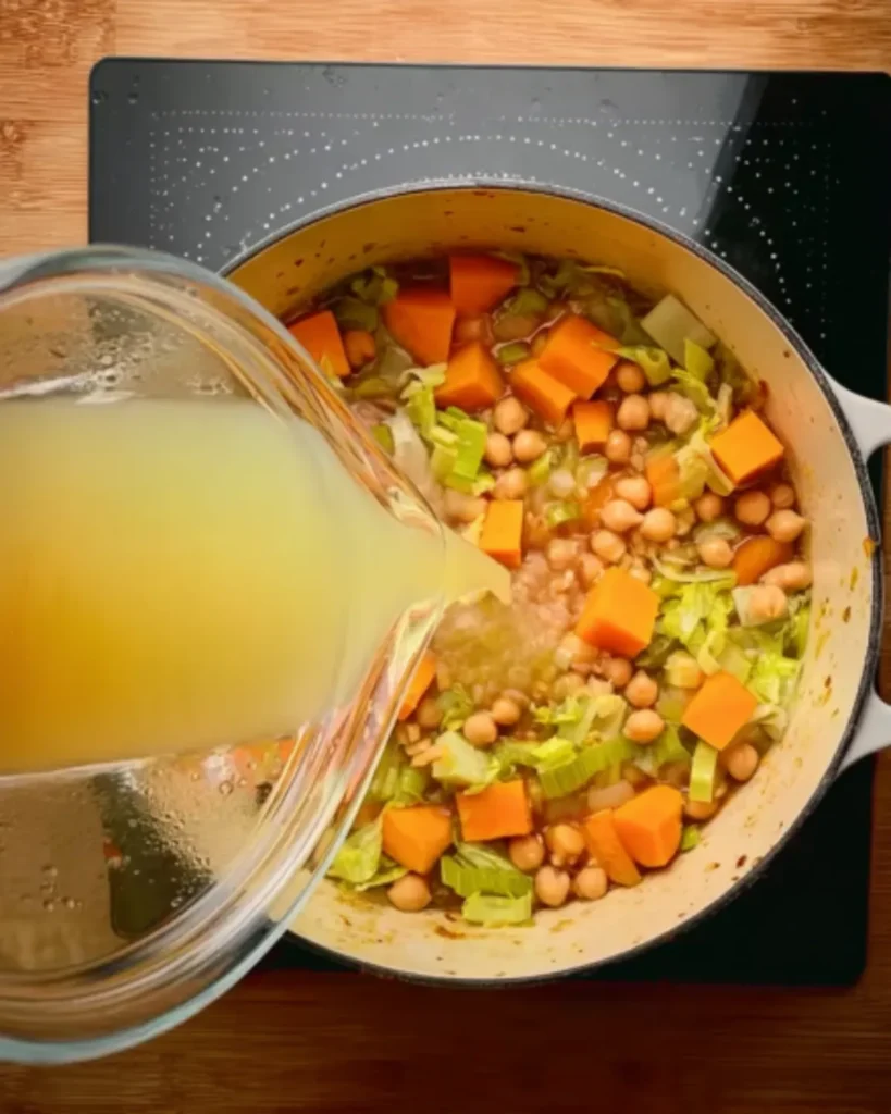 4. Add the chickpeas and vegetable stock. Bring to a simmer, cover, and cook for 20 minutes or until the pumpkin is tender.