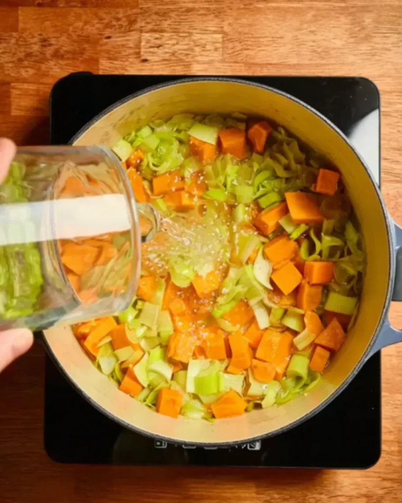 Start by heating olive oil in a large pot. Once hot, add the sliced leeks and cook gently for about 6–7 minutes until softened and fragrant. Stir occasionally—you’re building the foundation of the soup here.
