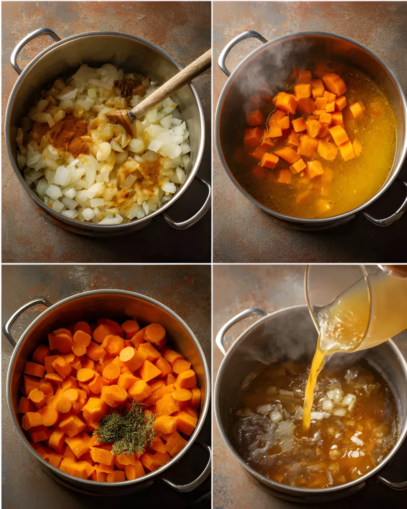 3. Add pumpkin and broth. Bring to boil, then reduce to simmer. Cover and cook 25–35 minutes.