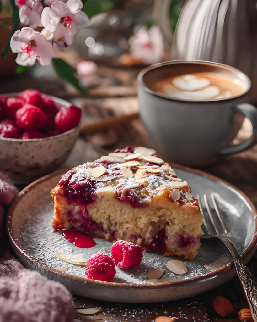 The aroma alone feels like home. As it bakes, the sweet almond scent fills the kitchen, while raspberries add a bright, slightly tart note. Every slice tells a story of comfort and creativity.