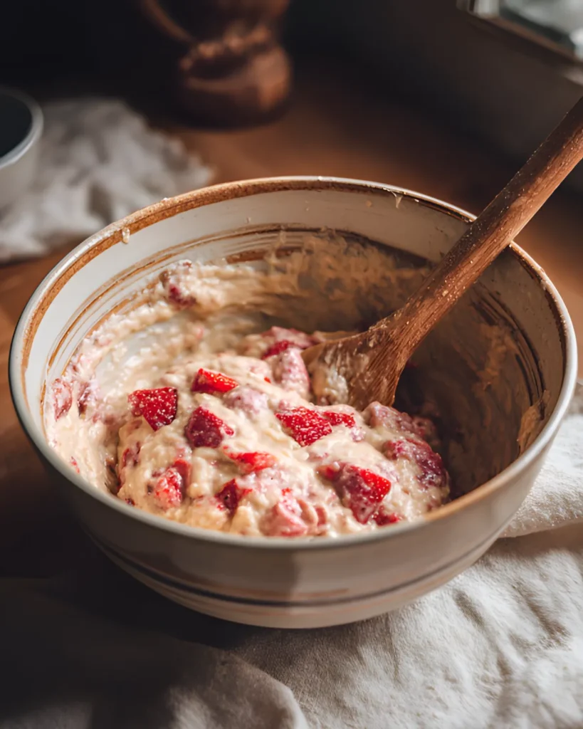 4. Toss diced strawberries with flour and gently fold them into the batter.
