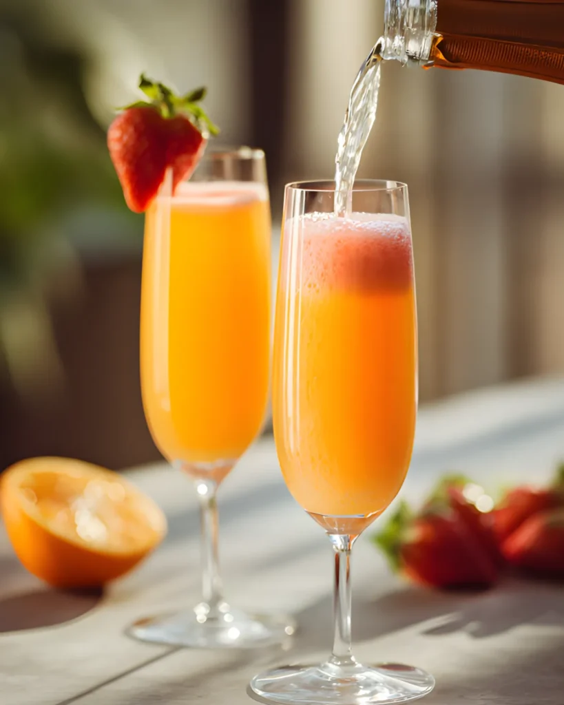 Next, chilled orange juice adds a bright citrus base. Fresh-squeezed juice works best because it delivers a clean, tangy taste. However, a high-quality store-bought option can still produce a great strawberry mimosa mocktail if you’re short on time.