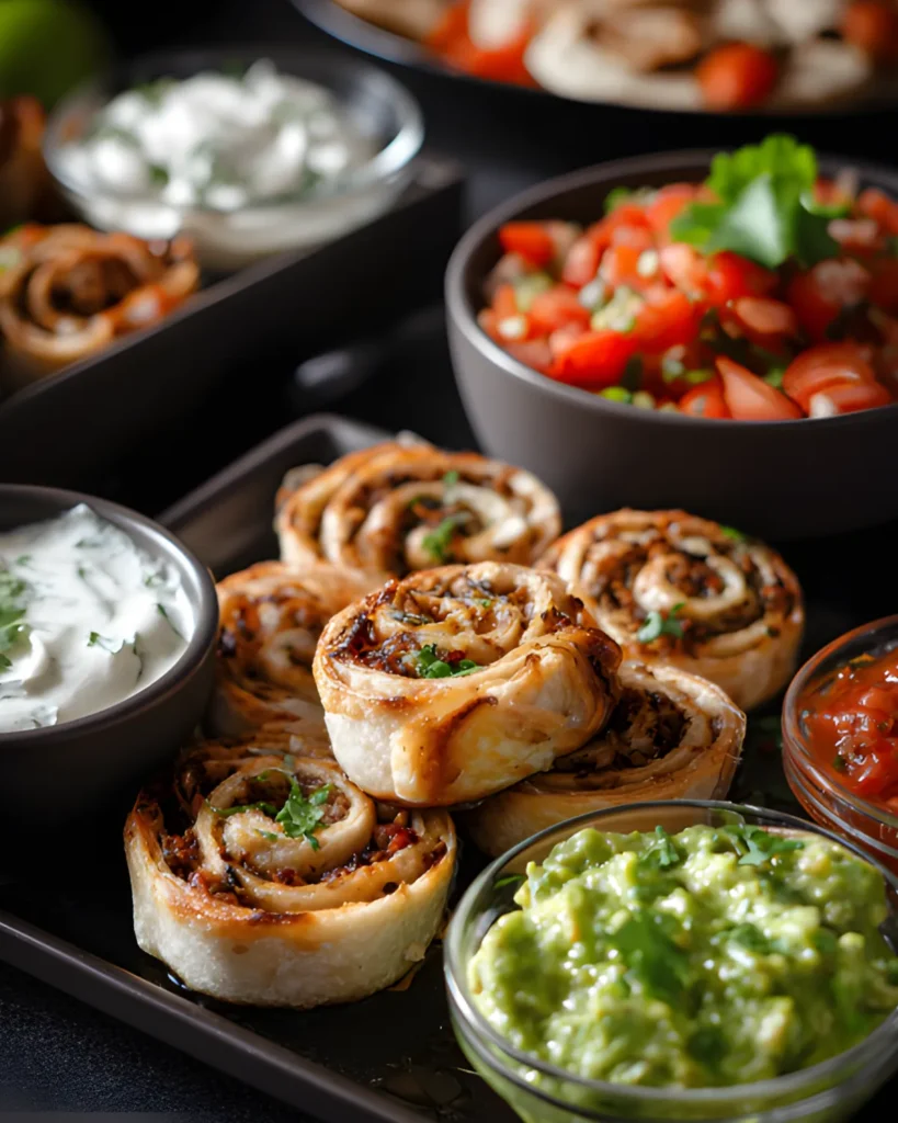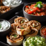 For parties, arrange the taco pinwheels recipe on a large platter in circular layers. This presentation looks appealing and makes it easy for guests to grab a piece. You can also pair them with dips like sour cream, salsa, or guacamole to enhance flavor.