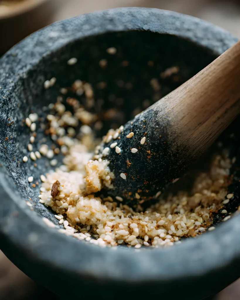 Because grinding releases essential oils from the sesame seeds and garlic, the flavor becomes stronger and more complex. Taste the paste. Then adjust salt or sugar as needed.